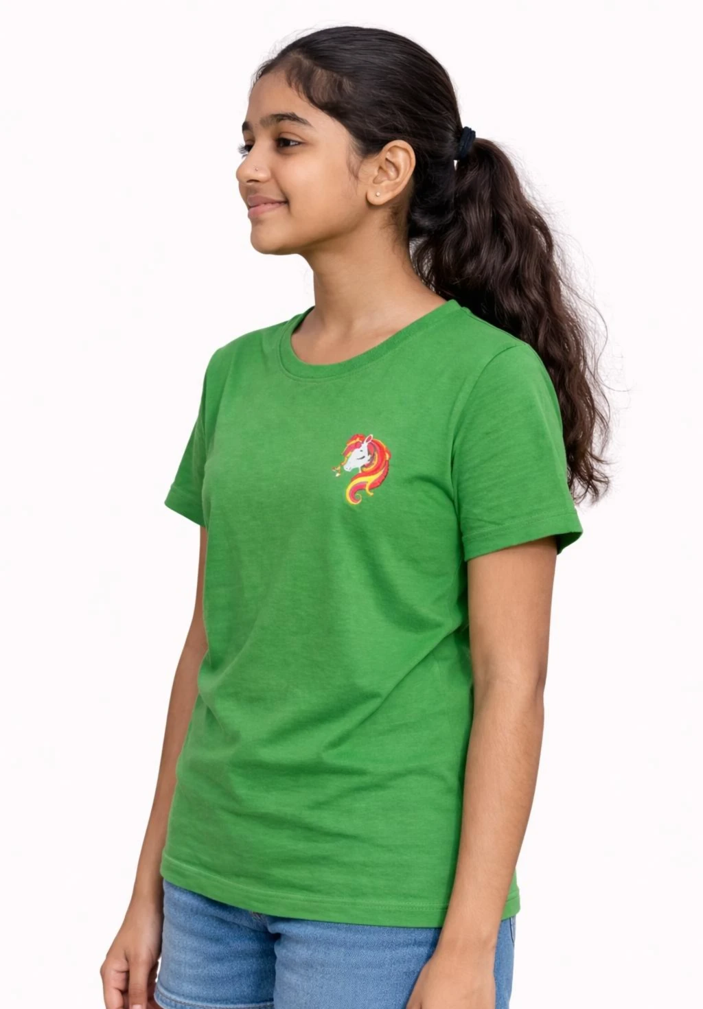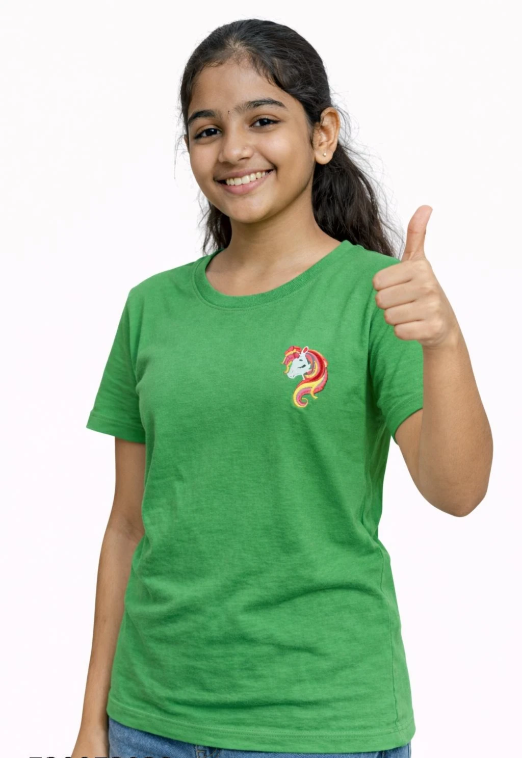 The Girl's Kelly Green Crew Neck T-Shirt with Unicorn Chest Embroidery is a vibrant masterpiece of youth fashion, meticulously designed to blend day-long comfort with a whimsical aesthetic that captures the magic of childhood. This garment is anchored by its striking Kelly Green hue—a lush, high-saturation shade that evokes the freshness of spring meadows and provides a bold, cheerful alternative to traditional pastels. Crafted from a premium, high-density cotton-blend jersey, the fabric offers a soft-to-the-touch feel against sensitive skin while maintaining enough structural integrity to withstand the rigorous activities of school, playdates, and weekend adventures. The silhouette is a classic, universally flattering crew neck design, featuring a reinforced ribbed collar that retains its shape wash after wash and short sleeves designed with an optimal cut to allow for a full range of motion. The focal point of this stylish piece is the intricate unicorn chest embroidery positioned delicately on the left side, which serves as a testament to fine craftsmanship; this isn't a simple screen print, but a dense, multi-thread embroidered motif featuring a palette of sunset yellows, fiery oranges, and soft pinks that create a three-dimensional effect. This mythical icon adds a touch of personality and "main character energy" to the shirt, making it a standout staple for any young girl